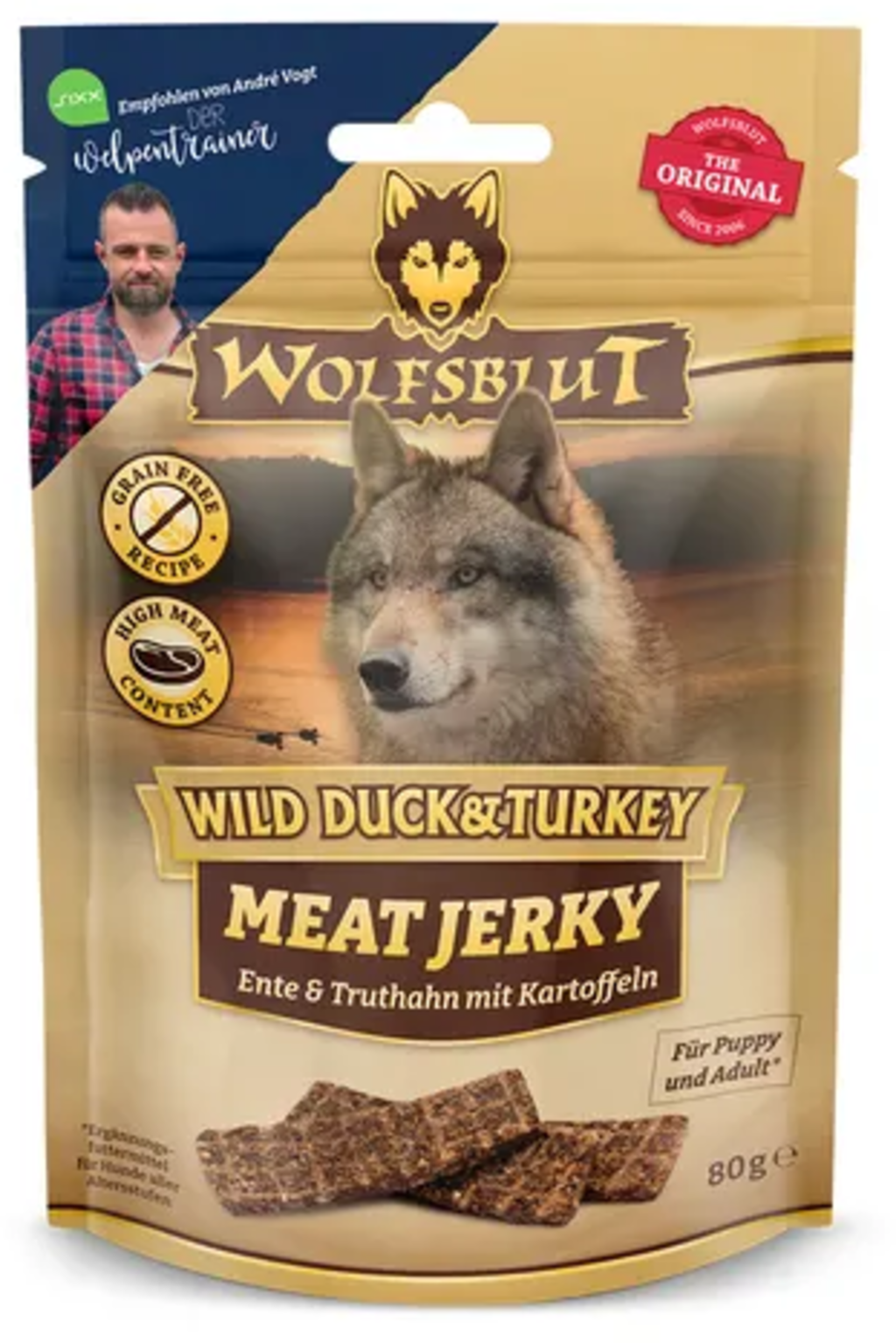 WOLFSBLUT Pamlsek pro psy Meat Jerky Wild Duck & Turkey, 80 g